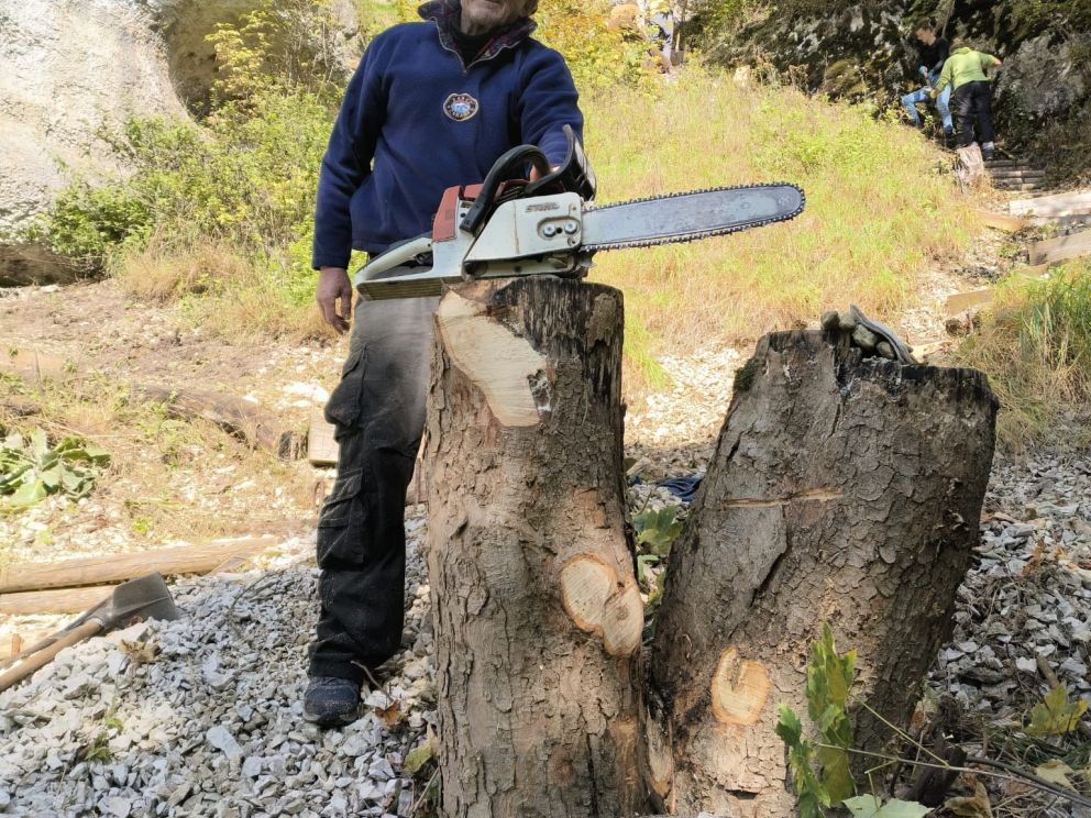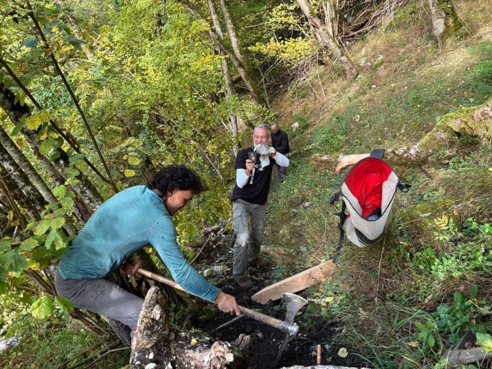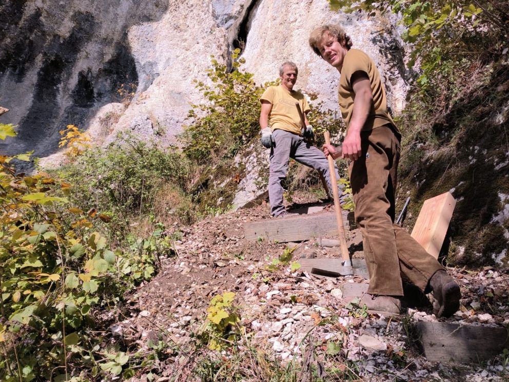 machten wir uns ans Werk:• Dachstein: Der Weg ist noch jung und weich – Ziel war es, den Zugang zum Sektor klar und sicher zu gestalten, damit alle Neugierigen ihn ohne Umwege finden.• Schaufelsen: Die Felsräumarbeiten im letzten Jahr hatten einige Wege beschädigt – diese wurden nun wieder instand gesetzt.• Aussichtsfelsen: Der östliche Abstieg wurde mit neuen Stufen versehen und damit deutlich sicherer gemacht.